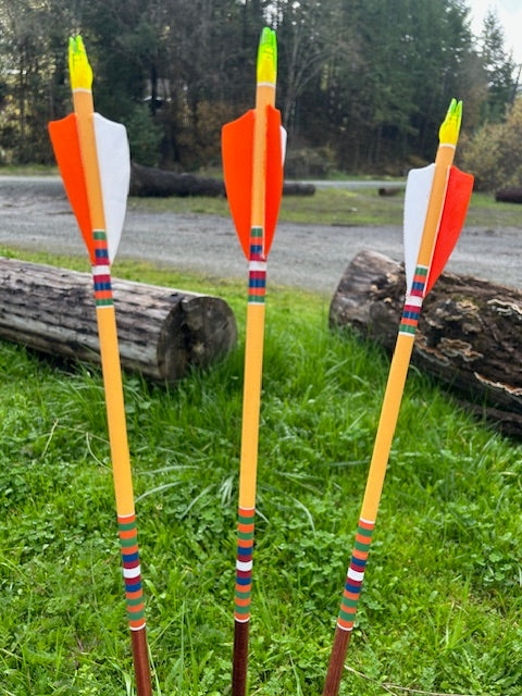 Mahogany Stain Shaft with a Yellow Crown dip, exclusive cresting and highlights fletched with 3" Left Wing Shield Cut White and Orange solid feathers.