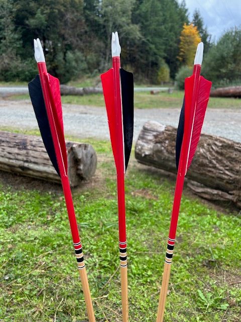 Clear Stain Shaft with a Red Crown dip, exclusive cresting and highlights fletched with 5" Left Wing Shield Cut Red and Black solid feathers.