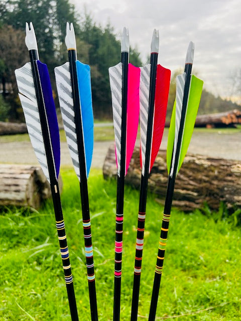 NIGHTFALL ARROWS 5/16 LESS THAN 30-POUND SPINE# 5 PACK Fully lacquered black shaft with exclusive cresting with Left Wing shield cut feathers, 4" Left wing cut parabolic solid White and...