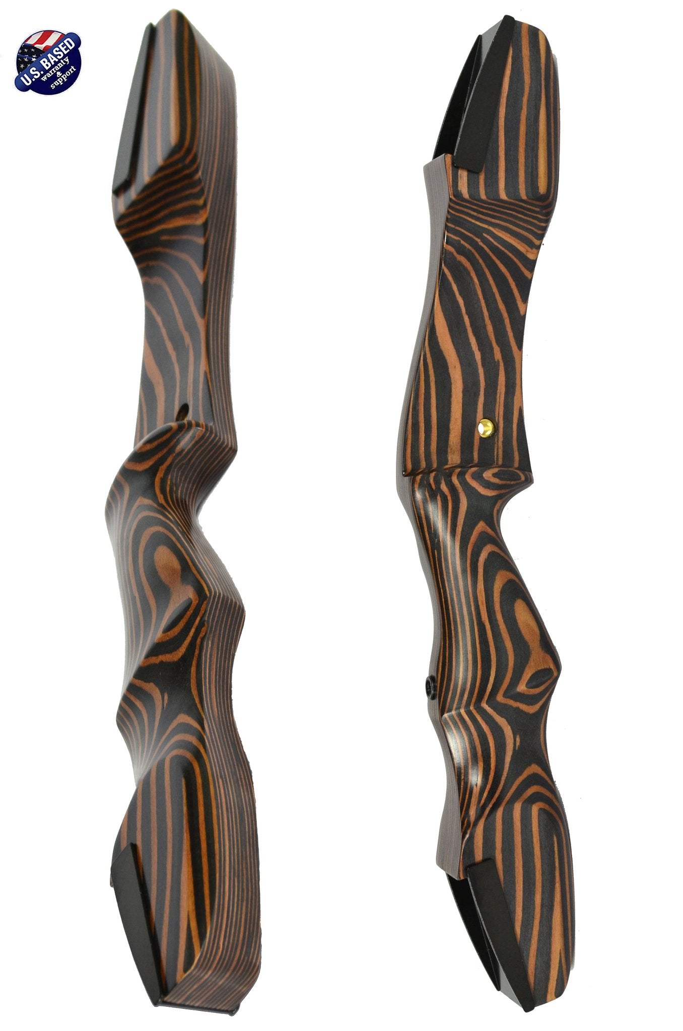 THIS BEAUTIFUL RISER, MADE ENTIRELY OF TIGER WOOD, COMES FULLY EQUIPPED WITH THREADED BUSHINGS FOR VARIOUS ATTACHMENTS SUCH AS SIGHT, REST/PLUNGER, AND STABILIZER/BOWFISHING REEL. THE LIMBS ARE MADE OF HARD MAPLE WOOD WRAPPED IN FIBERGLASS AND OFFER REINFORCED LIMB TIPS MAKING THEM FAST FLIGHT/FLEMISH STRING COMPATIBLE.